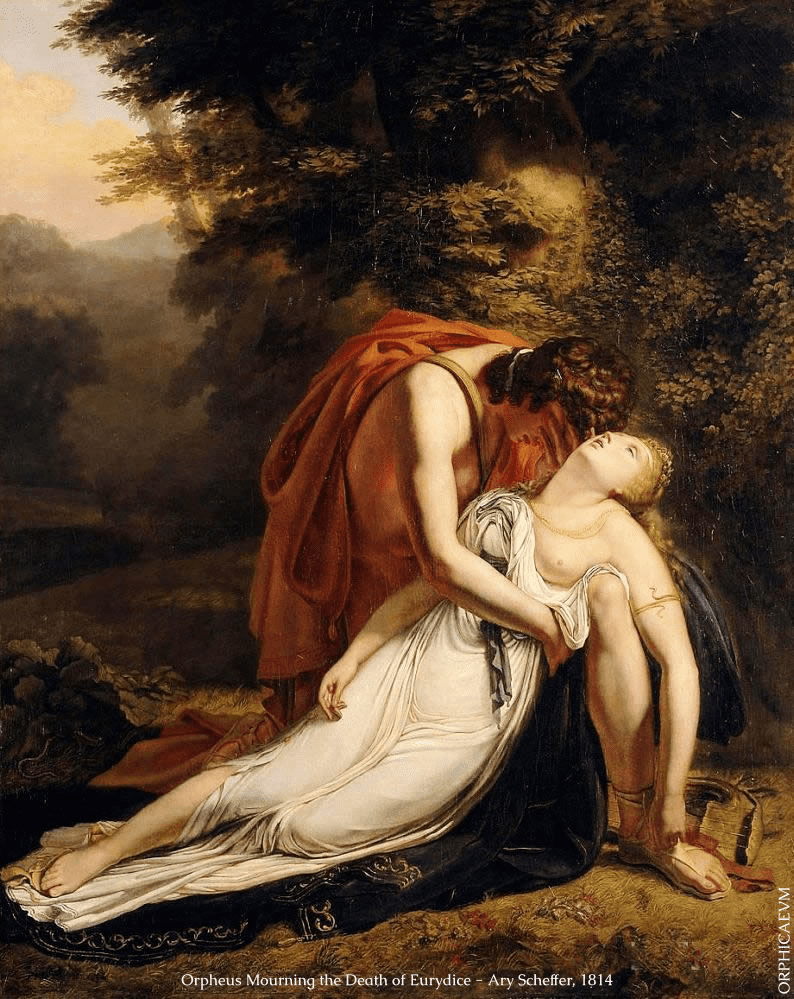 Eventually, Orpheus met and fell in love with Eurydice. On their wedding day, as she was picking flowers to prepare, Eurydice was bitten by a venomous snake and died. Orpheus played his lyre mournfully, and even the trees wept. But no length of time was long enough; Orpheus was not ready to accept that Eurydice was gone forever, and he set out to the Underworld to confront its King & Queen, and to demand that They return Eurydice to him in the daylight above.